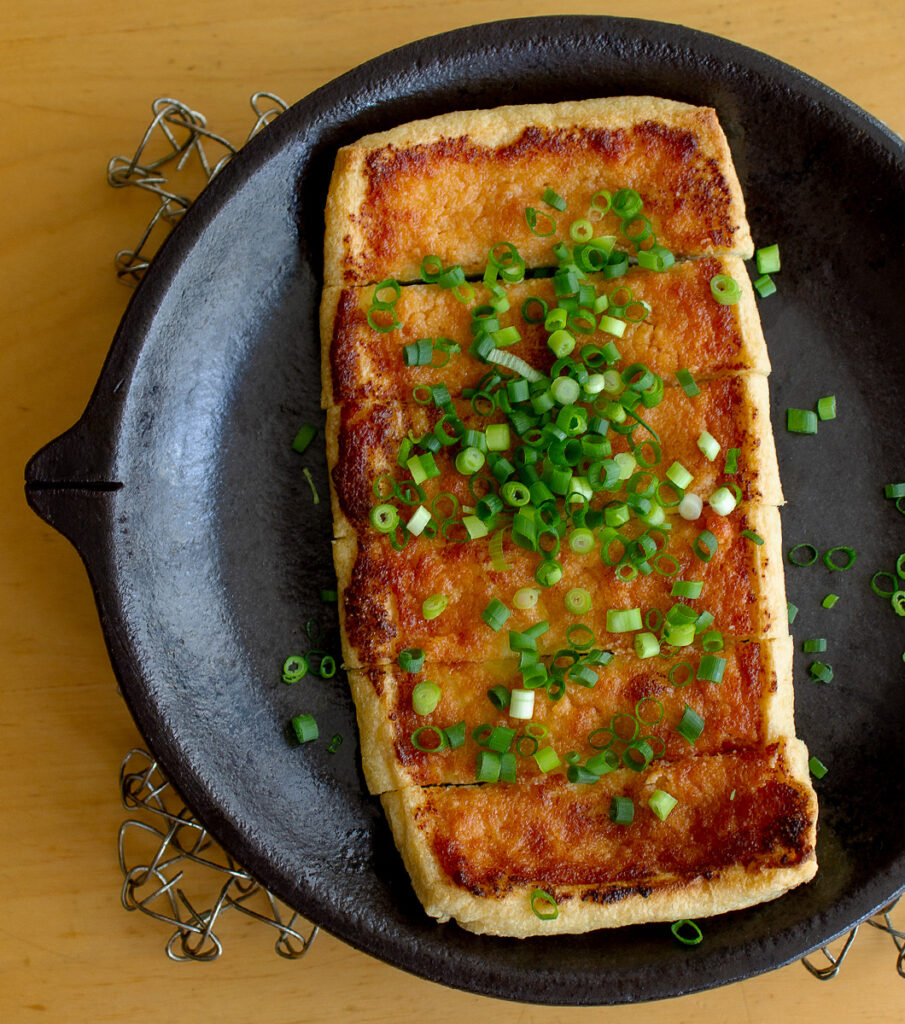 食べやすい大きさに切って陶板(直火の器)に戻し、ネギを散らす。