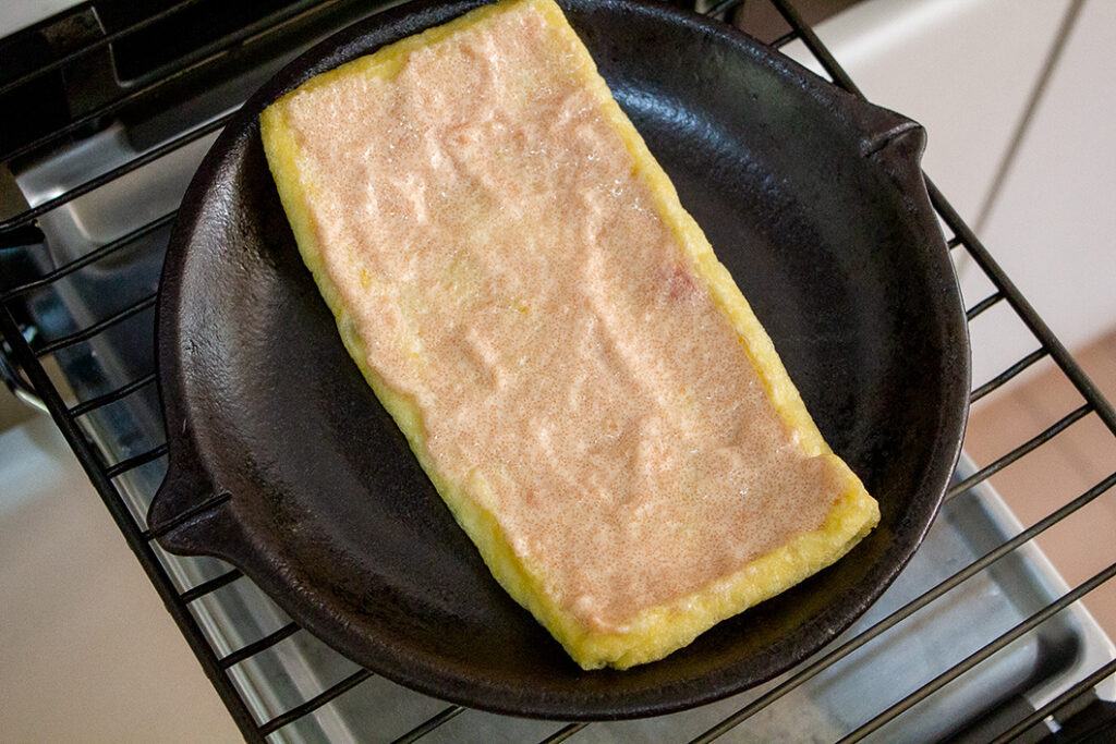 油揚げに(1)の明太マヨネーズを塗り、陶板や直火の器にのせる。魚焼きグリルに入れて弱火で約7分、好みの加減に焼く。