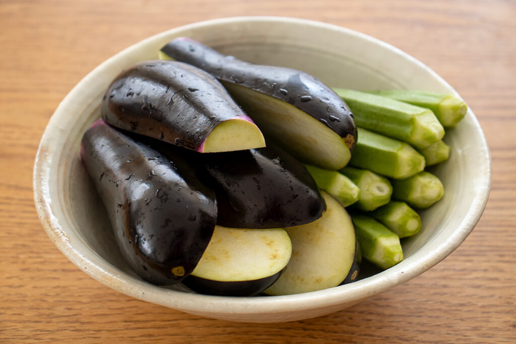 なすはへたの部分を切り落として縦半分〜1/4に切る。オクラはガクの黒くて硬い部分を削ぎ落とす。