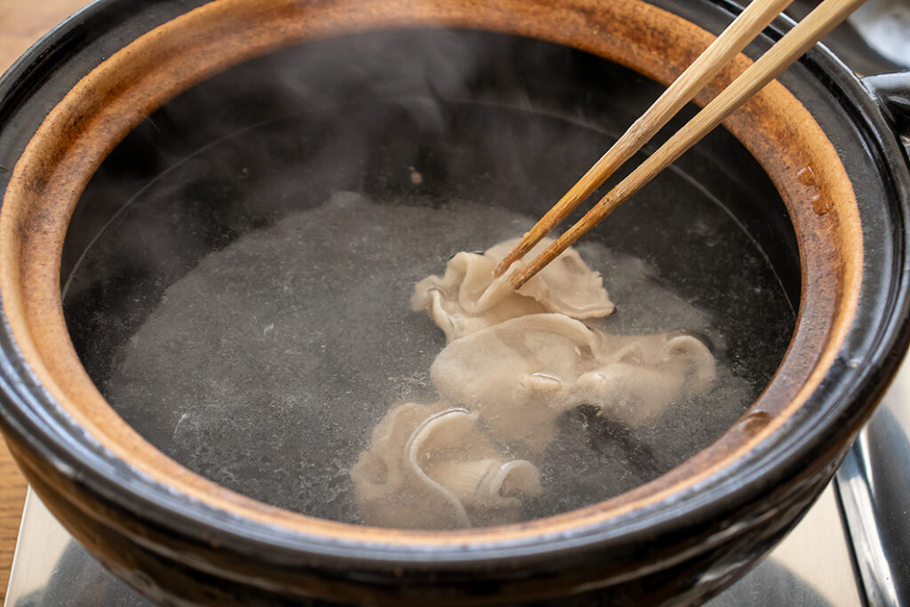 蒸し鍋に水(または湯)を六分目程度入れ、ふたをして(陶製すのこはセットしません)強火にかける。沸騰したら豚肉をしゃぶしゃぶの要領で煮る。肉の色が変わったら氷水に取り、ざるに上げて水をきる。保存容器に入れて冷蔵庫で冷やす。