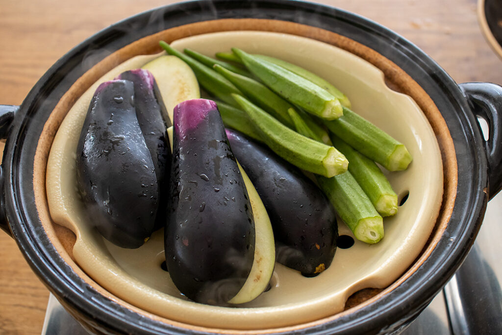 (2)の土鍋に陶製すのこをセットし、ふたをして再度火にかける。ふたの穴から蒸気が勢いよく出るまで沸騰したら、なす・オクラを入れて3〜5分蒸す。蒸し上がったら皿などに取って粗熱をとり、保存容器に移して冷蔵庫で冷やす。