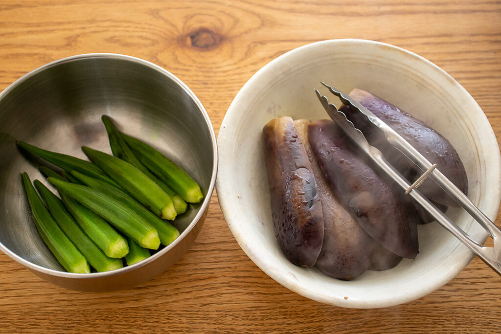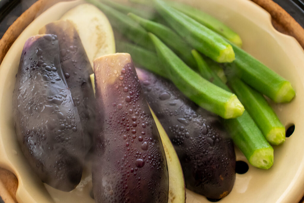 野菜は蒸しすぎに注意! オクラは3分ほどで蒸し上がります。なすは大きい場合は様子を見ながら5分ほど蒸してください。