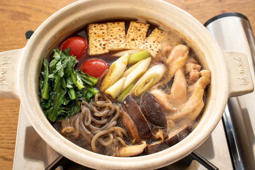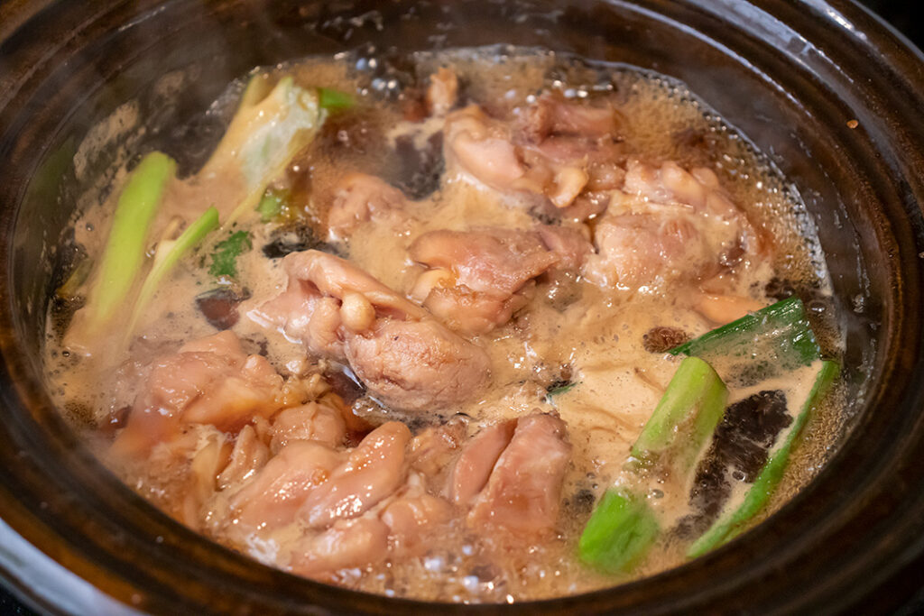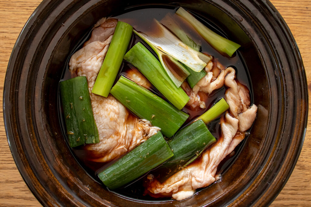 土鍋によく混ぜた【A】・鶏肉・長ねぎの青い部分を入れ、ふたをして30分おく(常温に戻す)。