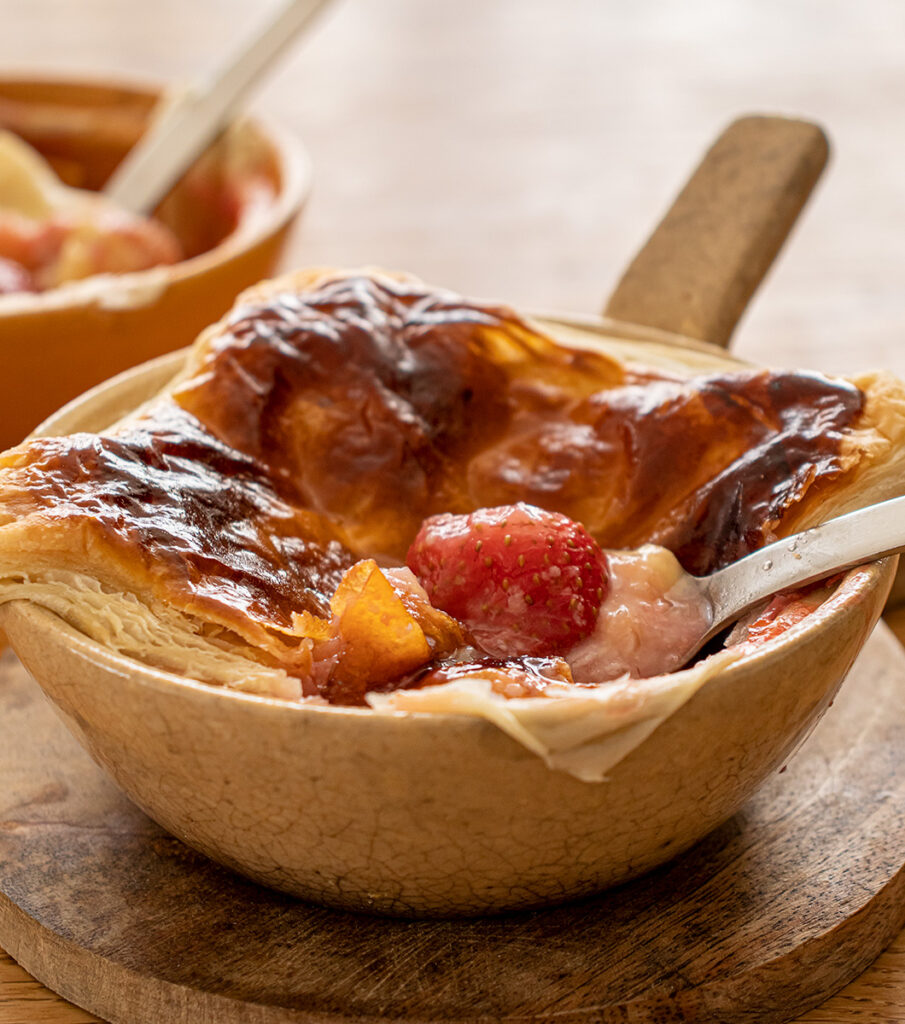 (2)にホワイトチョコを25gずつのせ、(3)のパイシートをかぶせる。端を土鍋にくっつけるようにして形を整え(ふたでパイ生地を押さえつける)、全体に卵黄を塗る。