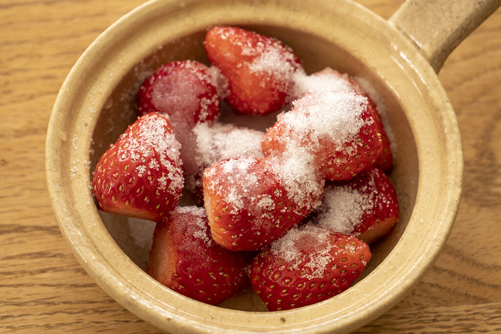 いちごは洗ってへたを除き、水気を拭く。エッグベーカー 大2個にいちごを10個ずつ入れ、砂糖小さじ2ずつ・レモン汁をそれぞれふりかける。