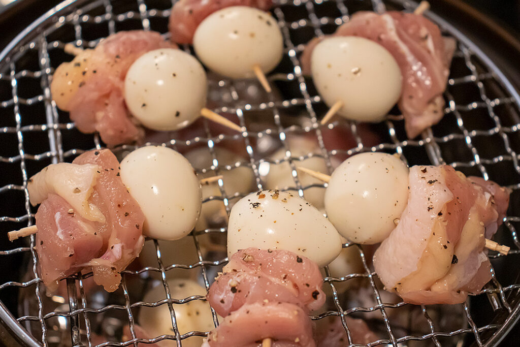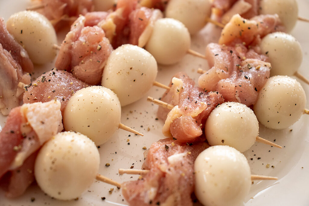 鶏肉は12等分に切る。つまようじに鶏肉とうずらの卵を刺し(最後にアスパラを刺せるようつまようじの先に余裕を残しておく)、全体にしっかり塩・こしょうをふって15分ほどおく。キッチンペーパーで軽く押さえて水気を除く。
