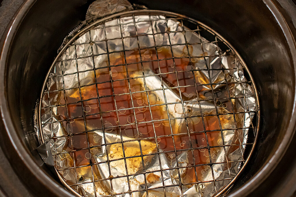 鶏肉から肉汁が出ますので、チップの上に必ず2枚目のアルミホイルを敷いて汁受けにしてください。そうすることでチップがしっかり燃え尽き、きれいに色付いた燻製になります。汁受けに残った肉汁は炒め物などの味付けに使えます。