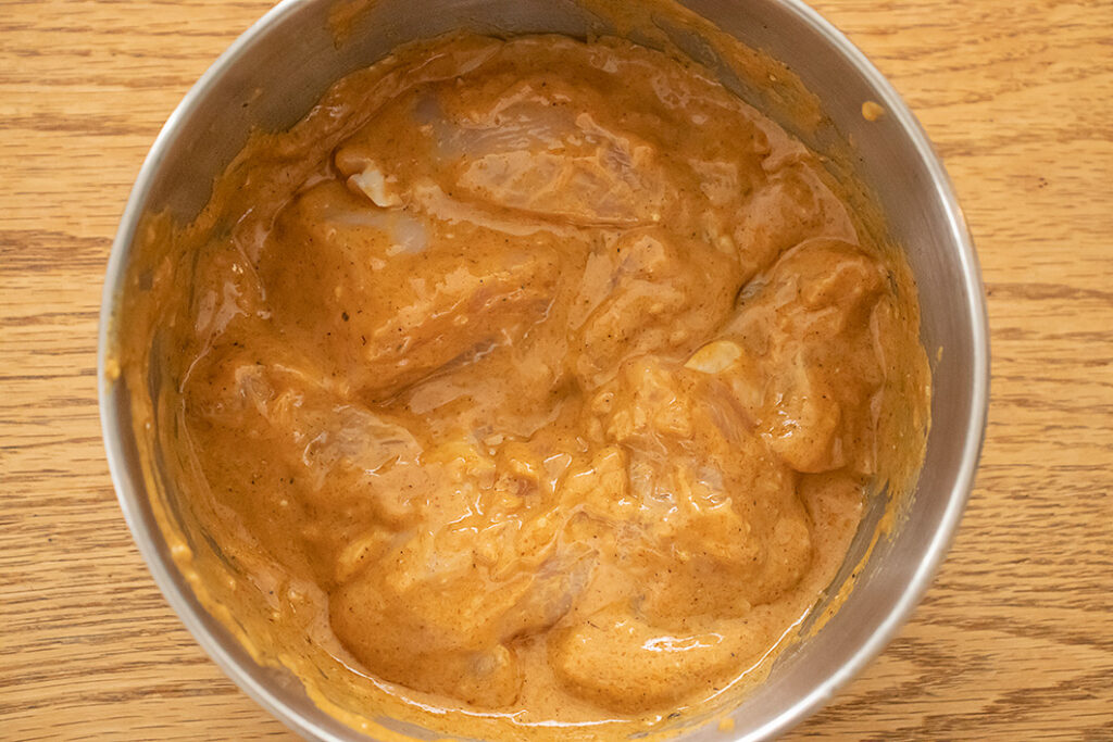 鶏肉は大きめの一口大に切る。【A】をボウルに入れてよく混ぜ、鶏肉を加えてよく和える。冷蔵庫で2時間以上漬け込む(調理する30分前に冷蔵庫から取り出す)。