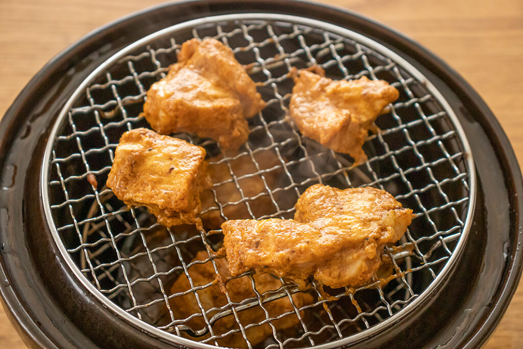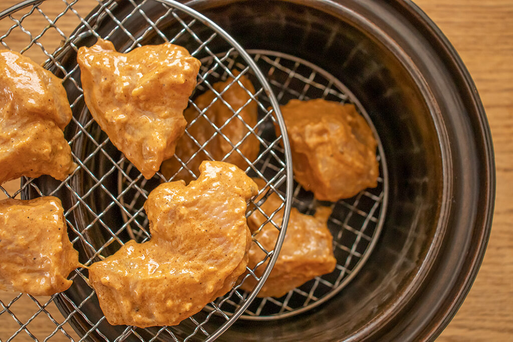 燻製土鍋「いぶしぎん」活用して、タンドリーチキンを作りました。味付けした鶏肉を燻製作りと似た工程で焼き上げます。
