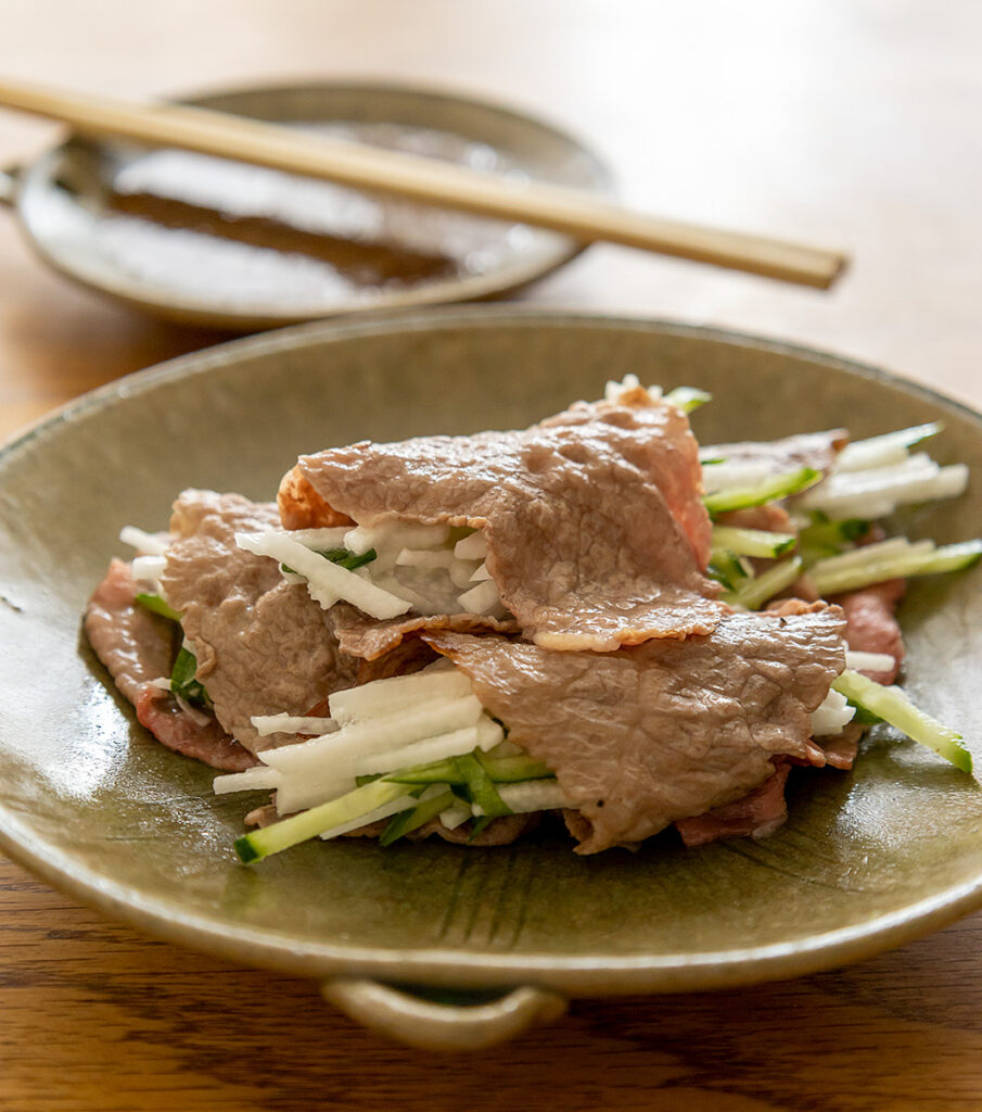 長いも(皮をむく)・きゅうり・大葉は千切りにする。切った野菜を全部ボウルなどに入れて合わせ混ぜ、器に盛り付ける。肉は大きいものは食べやすい大きさに切り、皿に並べる。