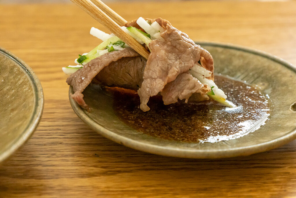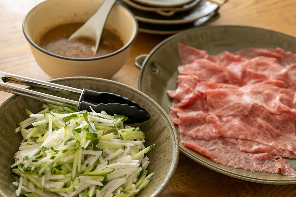 合わせ野菜はお好みで、カイワレ・長ねぎ・香菜など自由に組み合わせてください。今回はシンプルに牛肉だけですが、キノコや豚肉など、好きな具材を用意して楽しむのもおすすめです。