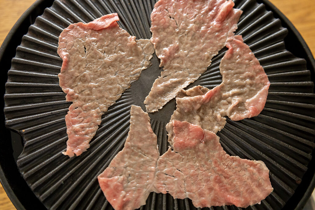 強火で約5分加熱し、陶板が十分に温まったら中火にする。肉を1枚ずつのせて好みの焼き加減になるまで焼き(肉を返す必要はありません)、皿に取る。合わせ野菜適量を肉の上にのせて巻き、タレをつけていただく。