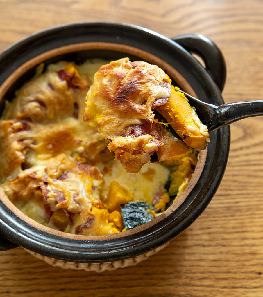 下ごしらえから仕上げ・食卓まで、土鍋一つでできる簡単グラタンです。おつまみ・おかずにどうぞ。