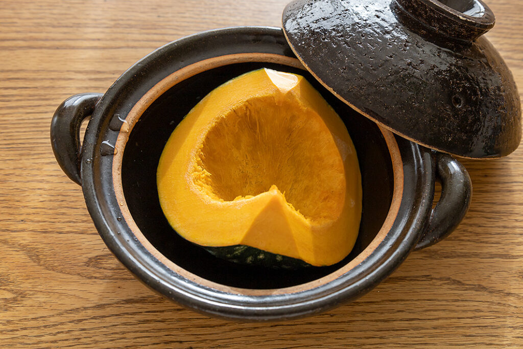 固いかぼちゃは電子レンジで少し加熱すると切りやすくなります。土鍋は電子レンジ・オーブンでも使えるので、ふたつきの耐熱器としてご活用ください。