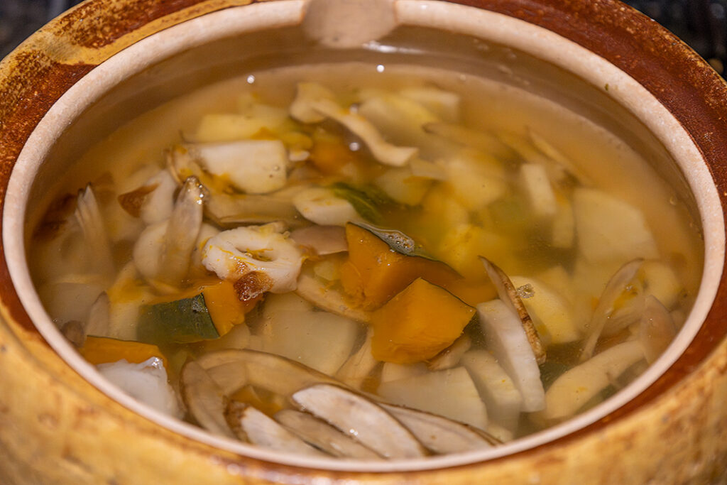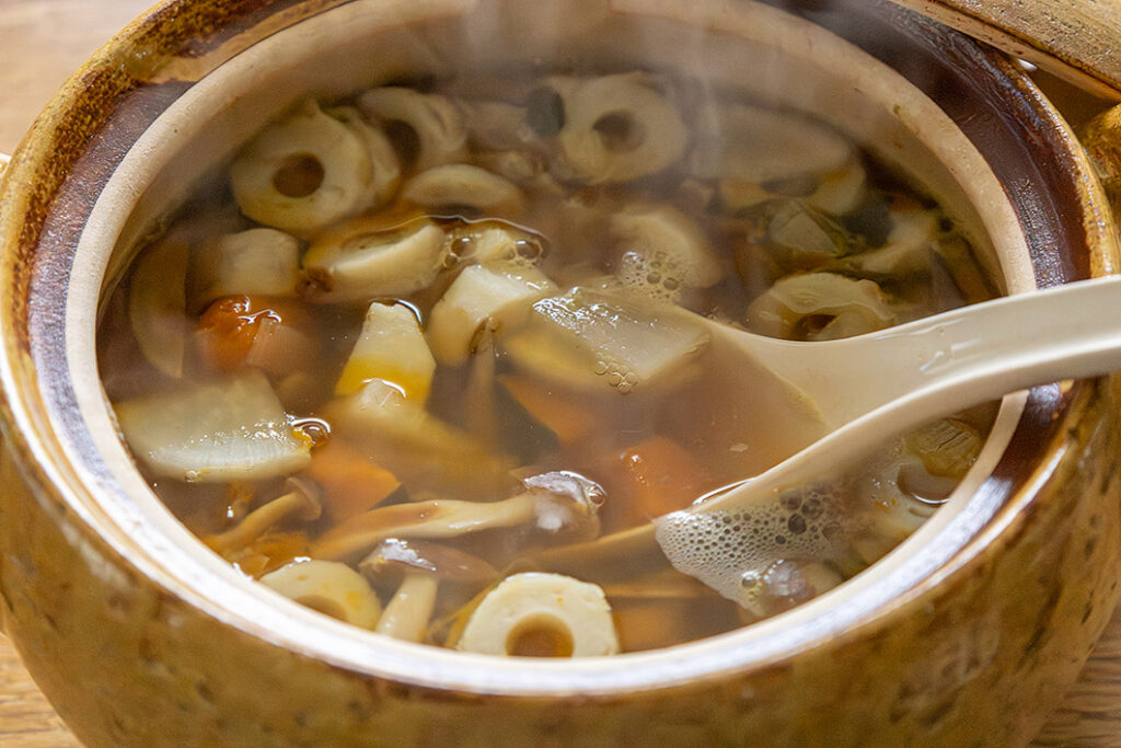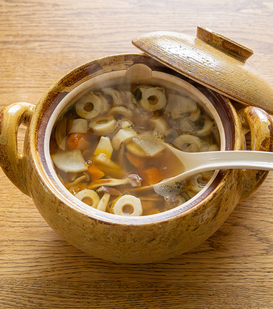 土鍋は重ね煮が得意。今回は蓄熱力抜群の「みそ汁鍋」で重ね煮を作り、具だくさんのけんちん汁に応用します。冷蔵庫の野菜などを自由に組み合わせて作れます。