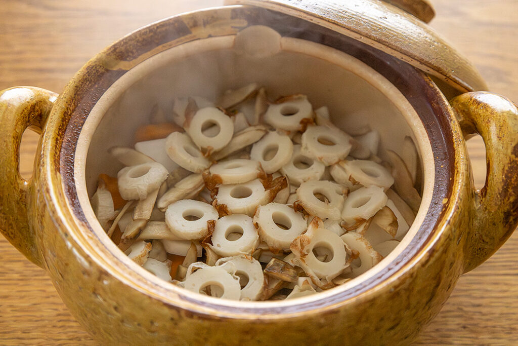 (3)土鍋に材料を重ね入れ、弱火で加熱する