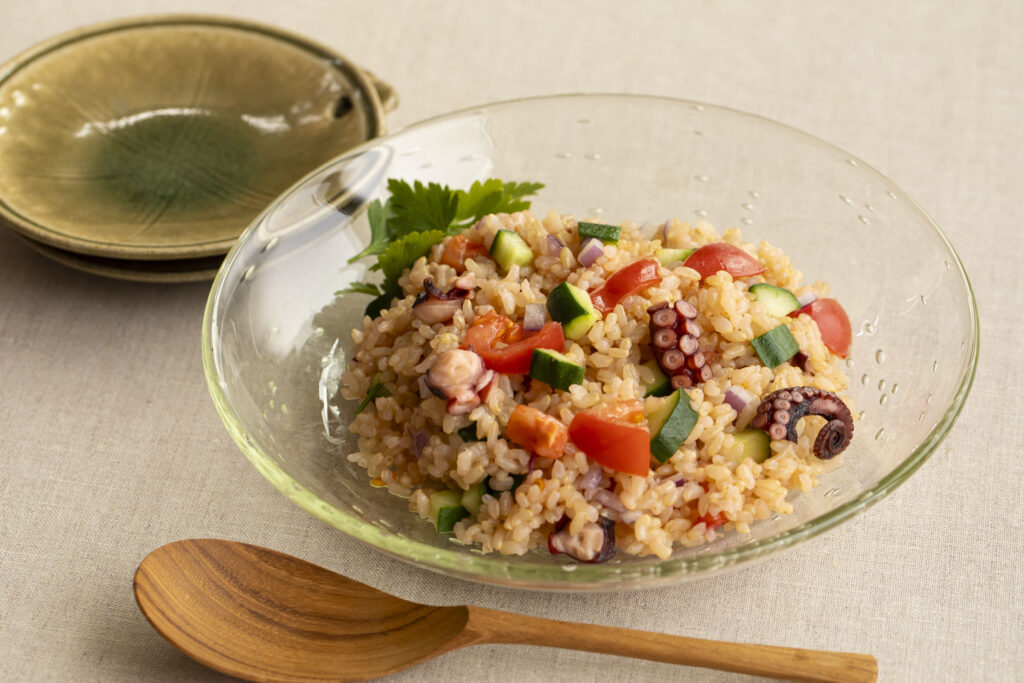 メニュー:ひじきとケッパーのごはん/タコの玄米混ぜごはん/蒸し料理(蒸し野菜・蒸し鶏とミネストローネの2段活用)/ 蒸しフルーツ