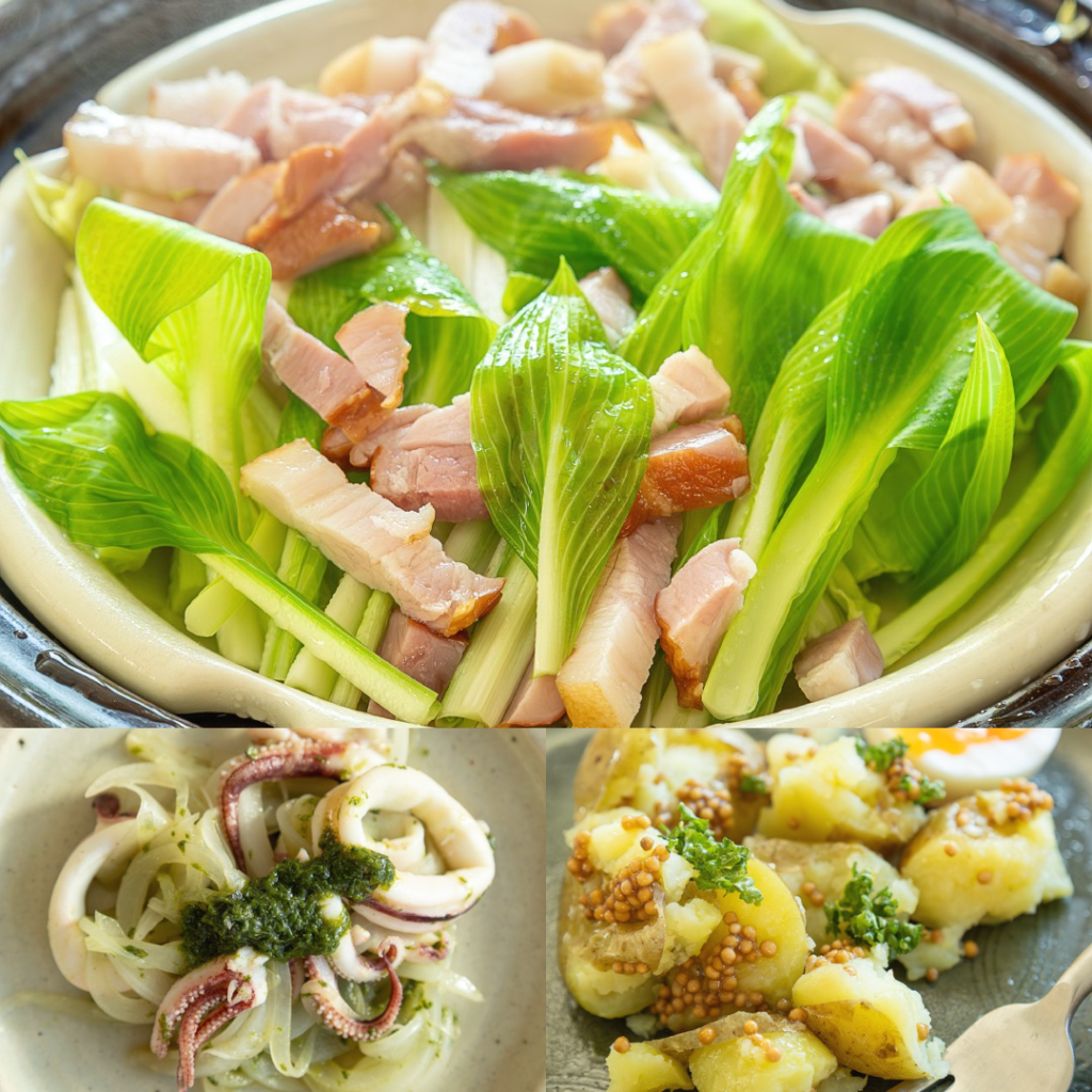 ・春の蒸しもの3種(春キャベツベーコン/新玉ねぎとヤリイカ/新じゃがいものマスタード和え)(ヘルシー蒸し鍋)