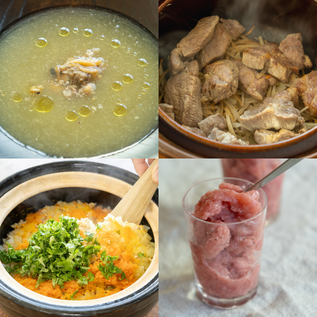 今回は春の食材を使った土鍋料理を5品ご紹介いたします。「ヘルシー蒸し鍋」で3種の蒸しもの、陶板鍋「ふっくらさん」で豚肉と春野菜のグリル、「伊賀土鍋」で新玉ねぎのスープ、「かまどさん」で春の炊き込みごはん、デザートにいちごを甘酒で煮込んだシャーベットをデモンストレーション形式でご覧いただきます。