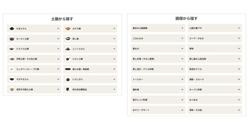 これまで同様、土鍋別での検索に加えて、気になるワードでの検索や「ごはんもの」「煮物」「オーブン料理」など調理ジャンルでの検索がより便利になりました。